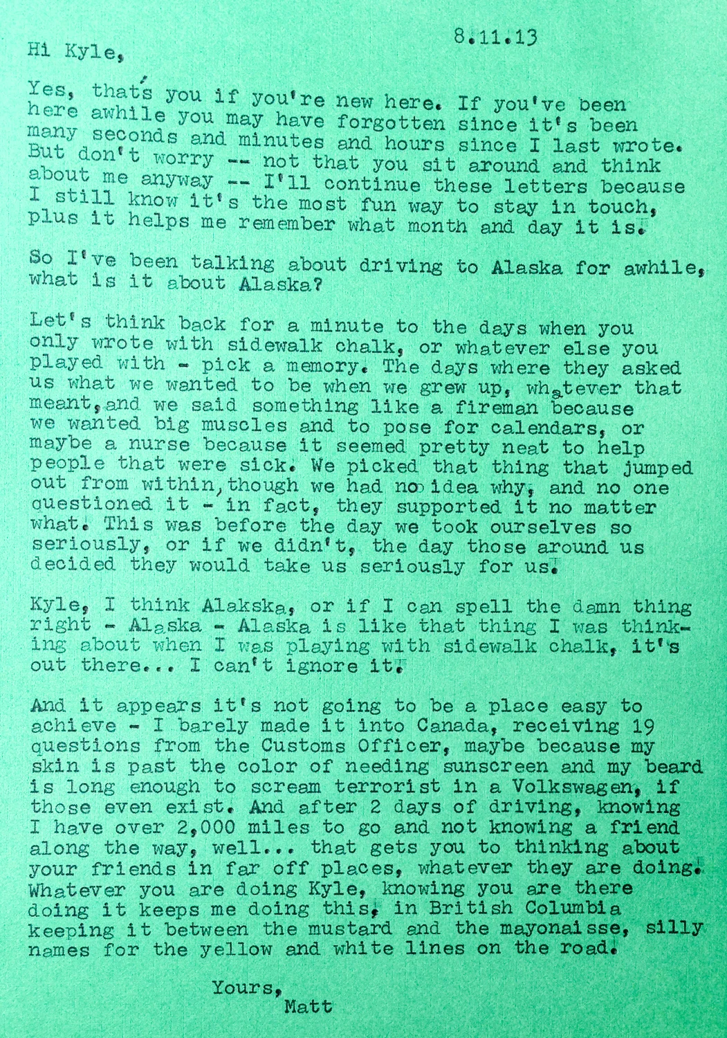 exploration, journalism, travel, short storyMatt McDonaldAugust 11, 2013letters, alaska, kyle, whygo, vanlife, volkswagen, Vanagon Letter - What is it about Alaska? exploration, journalism, travel, short storyMatt McDonaldAugust 11, 2013letters, alaska, kyle, whygo, vanlife, volkswagen, Vanagon Matt McDonald Facebook0 Twitter LinkedIn0 Reddit Pinterest0 0 Likes